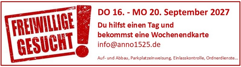 Wer bei ANNO 1525 entsprechende Requisiten tragen (führen) möchte, muss Mitglied einer mittelalterliche Gruppe sein, die beim Veranstalter unter Vertrag steht. Festbesucher dürfen leider keine Waffen tragen (führen). Bitte verzichtet darauf! Wir bitten um Verständnis.